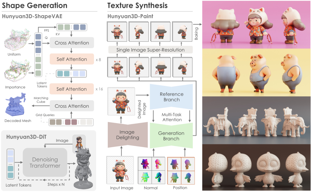 Hunyuan3D 2.0 opiera się na dwóch głównych komponentach, każdy z nich odpowiada za odmienny aspekt generowania modeli 3D: