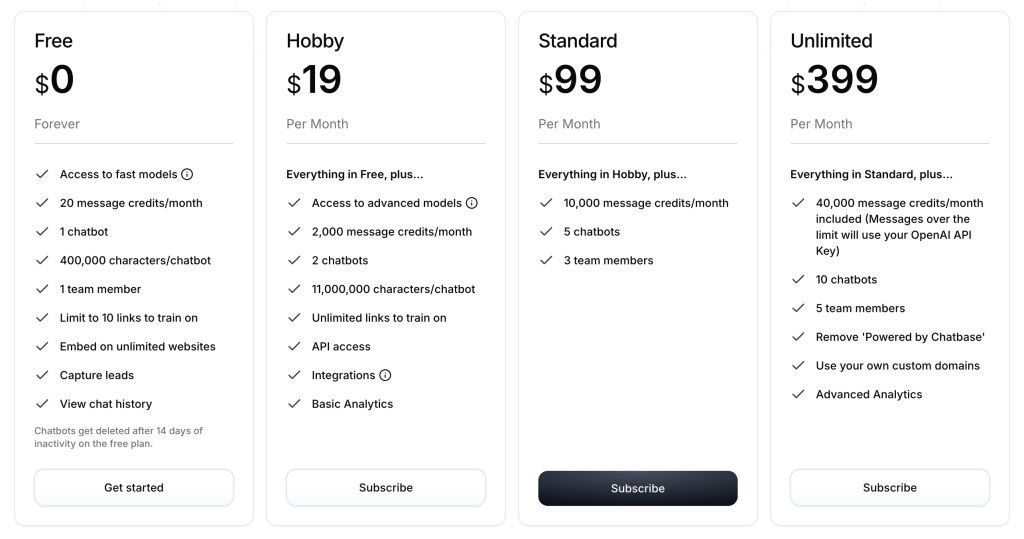 Chatbase.co udostępnia wersję darmową do testów i 3 progi płatne.