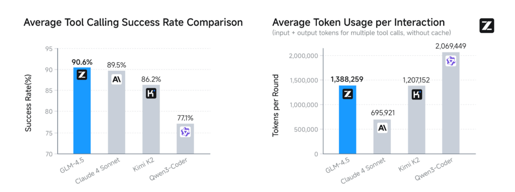 - W benchmarkach tau-bench i BFCL v3, które mierzą zdolność do korzystania z narzędzi, GLM-4.5 dorównuje wydajnością modelowi Claude 3 Sonnet.